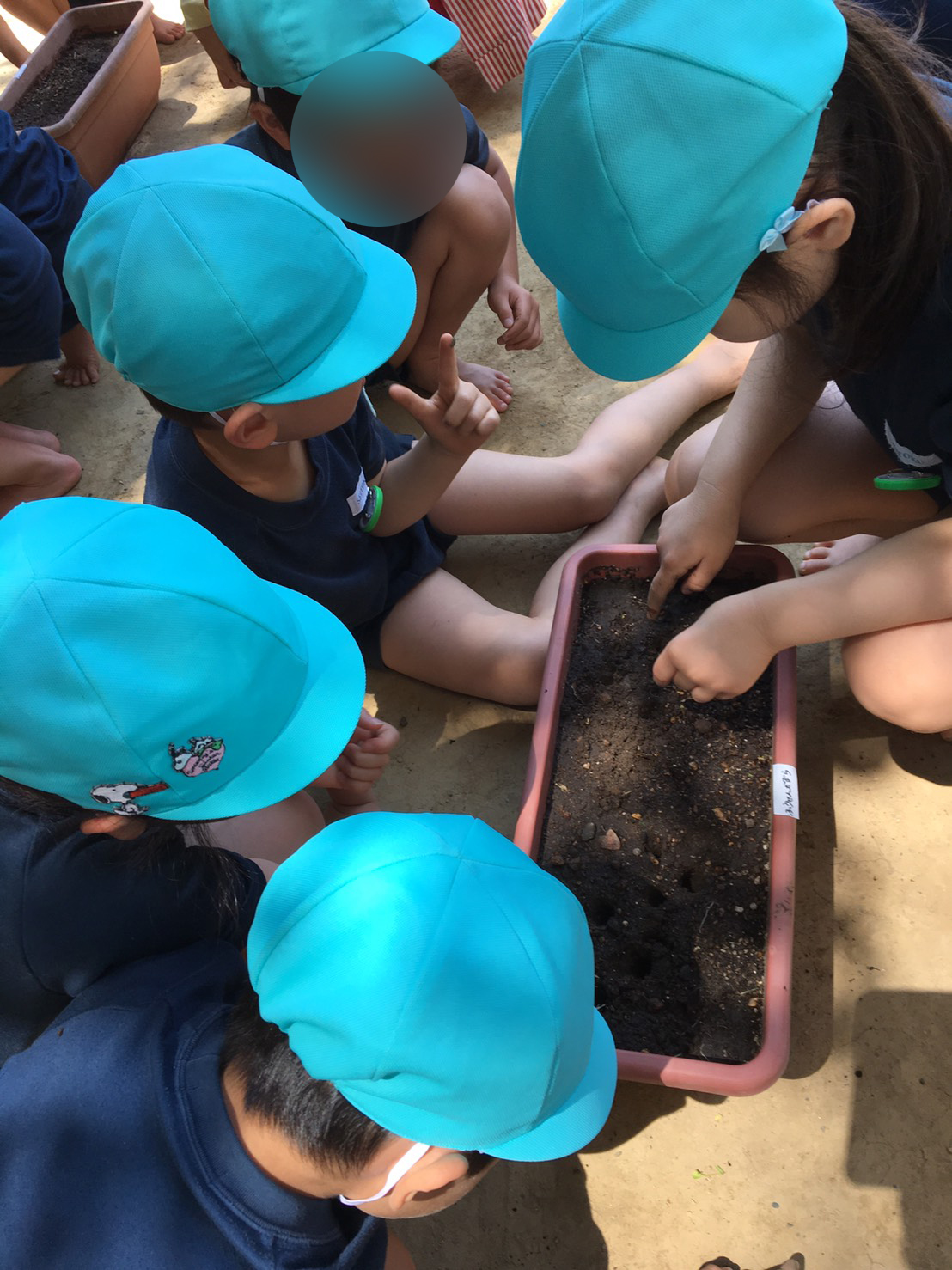 種まき、苗をうえました。おきくなーれ、おーきくなーれ!おーきくなーれ!